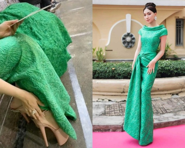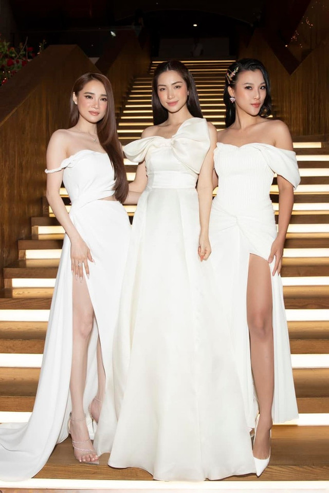 Váy trùm gót chân giúp che đi đôi giày lênh khênh của Hòa Minzy khi cô đọ sắc bên cạnh đồng nghiệp.