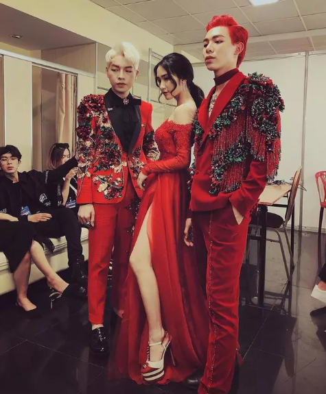 Nhờ đôi giày nâu có phần đế cao khoảng 25 cm, Hòa Minzy tự tin sánh vai bên cạnh siêu mẫu Minh Tú.