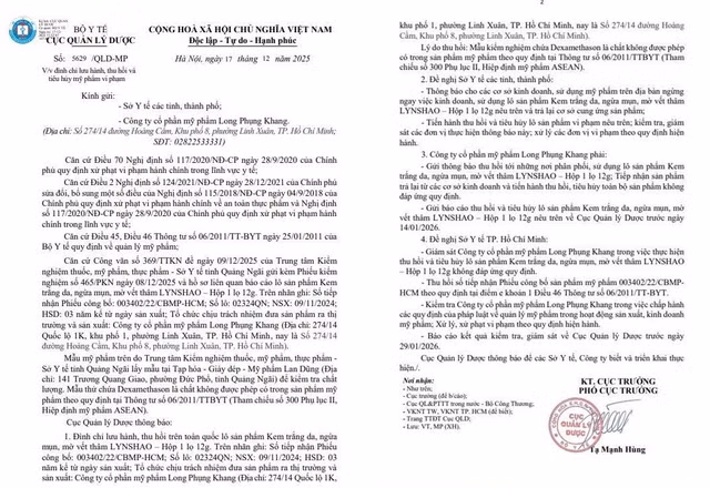 Trước đó, ngày 17/12/2025, Cục Quản lý Dược (Bộ Y tế) cũng đã có thông báo đình chỉ lưu hành và tiêu hủy mỹ phẩm kem trắng da, ngừa mụn LYNSHAO Hộp 1 lọ 12g vi phạm của Công ty cổ phần mỹ phẩm Long Phụng Khang.