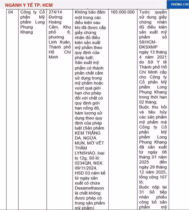 Với các sai phạm trên, Công ty Cổ phần Mỹ phẩm Long Phụng Khang bị Sở Y tế TP. Hồ Chí Minh xử phạt 165 triệu đồng. Ngoài xử phạt hành chính, Công ty này còn bị tước quyền sử dụng giấy chứng nhận đủ điều kiện sản xuất mỹ phẩm số 58/HCM-ĐKSXMP (Sở Y tế TP. Hồ Chí Minh cấp ngày 13/4/2021) trong thời hạn 2 tháng; Buộc thu hồi và tiêu hủy các sản phẩm mỹ phẩm mà Công ty Cổ phần Mỹ phẩm Long Phụng Khang đã sản xuất từ ngày 6/1/2025 đến ngày 29/12/2025, tổng cộng 107 lô; Buộc nộp lại 31 Số tiếp nhận phiếu công bố sản phẩm mỹ phẩm mà Công ty Cổ phần Mỹ phẩm Long Phụng Khang đã sử dụng để sản xuất từ ngày 6/1/2025 đến ngày 29/12/2025; Buộc thu hồi và tiêu hủy toàn bộ lô Sản phẩm Kem trắng da, ngừa mụn, mờ vết thâm LYNSHAO, loại lọ 12g, Số lô 0234QN, NSX 9/11/2024, HSD 03 năm kể từ ngày sản xuất.
