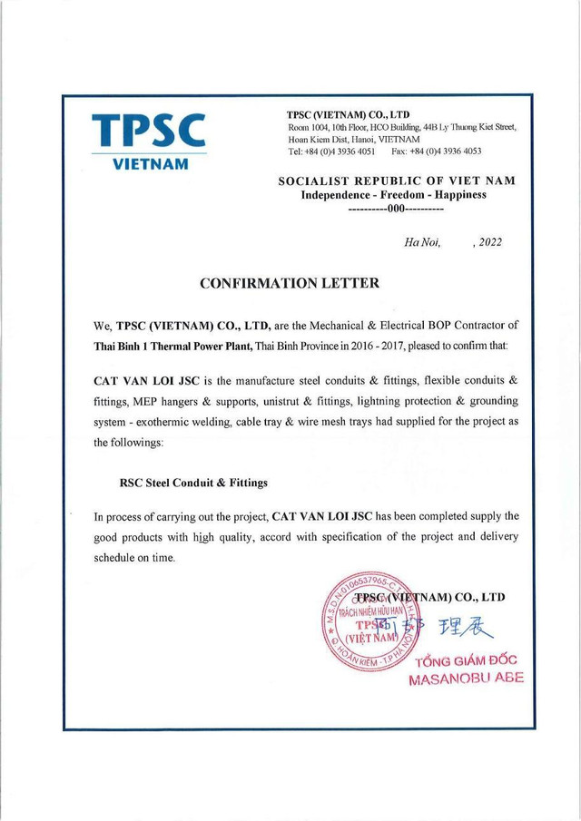 Vừa qua, Cát Vạn Lợi đã cung ứng các sản phẩm vật tư cơ điện cho dự án nhà máy Nhiệt Điện Thái Bình 1 thuộc Tập đoàn Toshiba Plant Systems & Services Corporation (TPSC Việt Nam) và nhận được sự đánh giá cao về chất lượng sản phẩm và dịch vụ.