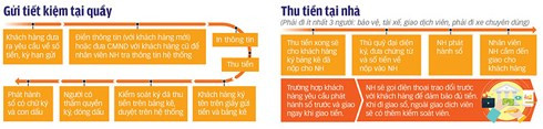 Trao đổi với PV, giám đốc khối khách hàng cá nhân một NH cổ phần lớn tại Q.3 cho biết quy trình mở sổ tiết kiệm lúc nào cũng có ít nhất 3 "tay" (như sơ đồ), kể cả mở sổ tại quầy hay tại nhà nhằm kiểm soát lẫn nhau và giảm thiểu rủi ro.