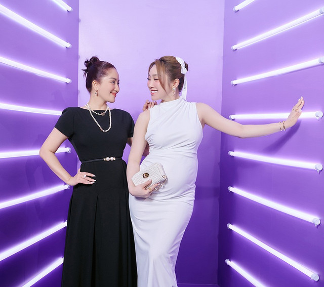 Bà mẹ 3 con Khánh Thi xuất hiện với đầm đen thanh lịch, giản dị nhưng phủ nguyên cây trang sức đồ hiệu. Cô cũng gây bất ngờ vì vóc dáng đã thon gọn hơn hẳn sau sinh em bé. Song cô vẫn đặt mục tiêu giảm 10kg trong thời gian tới.