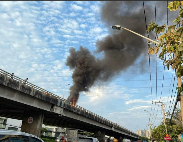 Nhận được tin báo, lực lượng PCCC điều phương tiện đến hiện trường triển khai dập lửa. Làn đường trên cầu Phú Mỹ hướng từ TP Thủ Đức về quận 7 được phong tỏa để triển khai chữa cháy.