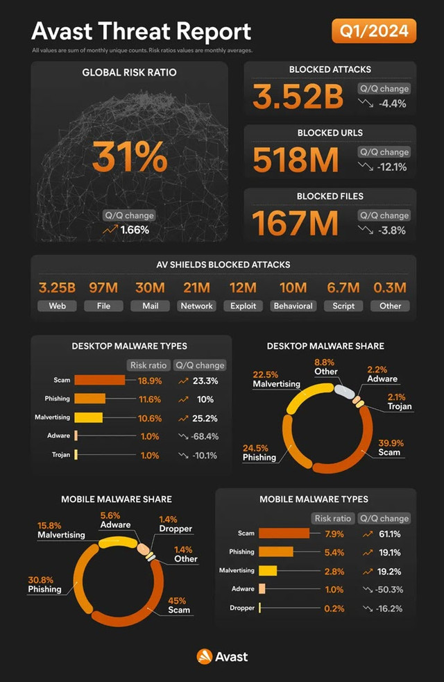 Báo cáo của Avast về hoạt động chống lại các đối tượng độc hại trong quý 1 năm 2024.